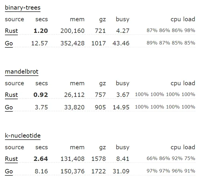 While both approaches have their pros and cons, generally speaking Rust’s compiler optimizations result in more performant programs. Alternatively, Go’s application code is cleaner because memory management is fully handled by the runtime.